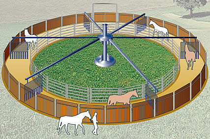 | Freilaufführanlagen haben sich in vielen Zucht- und Reitbetrieben als unentbehrliches Trainingsgerät etabliert. Dem Pferd wird auf eine sichere und kontrollierte Methode zusätzliche Bewegung verschafft. Das dient der gesundheitlichen Verfassung, sowie der Steigerung und Erhaltung der Leistungsfähigkeit des Pferdes. |