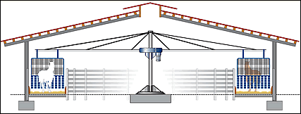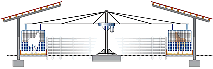 | Eine platzsparende Innovation – die Führ- und Longierhalle mit Deckenführanlage. Bei dieser Hallenkonstruktion schlagen Sie zwei Fliegen mit einer Klappe. Im Innenbereich kann longiert werden. Die stabile, feuerverzinkte Stahlkonstruktion wird vom First der Hallenkonstruktion abgehängt. |